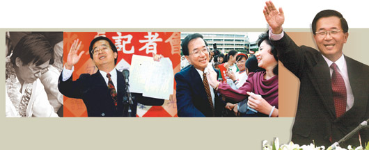1986年,陈水扁担任台北市议员,因蓬莱岛事件入狱,但也为他政治生涯加分;担任“立委”期间,他一再揭发军购弊案,被民间团体票选为第一名“立委”;1994年,他当选台北市长,施政满意度一度高达76%;2000年,他当选第一次政党轮替的台湾地区领导人;昨天,他却成为第一位手铐加身的前领导人。