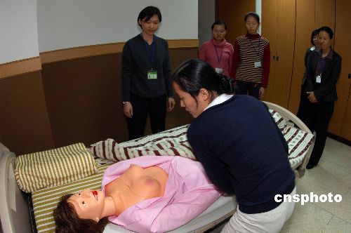 12月14日,厦门长庚医院的大陆护理人员,在台湾长庚医院的两位资深护理老师的指导下开始在该院的“模拟病房”进行医护培训。厦门长庚医院是台湾长庚医院在大陆的首个医疗中心,该院定位为三甲医院和平民医院,整个医学园区的总占地面积有70公顷,其中医院区占地32公顷,主要规划有3,000床综合医院及其他配套,由长庚医院方投资13多亿元人民币主导建设。目前,该院的“模拟病房”开始投入使用,人才招募、医护培训等“软建设”也已全面展开,预计明年八九月份正式对外开业。中新社发 黄少毅 摄
