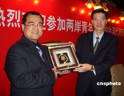 十二月十六日深夜,中国国民党副主席、青年团总团长林益世(左)率领刚刚在北京出席完“两岸青年论坛”的国民党青年团部分代表一行四十余人抵达上海参访。图为中国共产主义青年团上海市委书记马春雷(右)向林益世一行赠送纪念礼品。中新社发 许晓青 摄