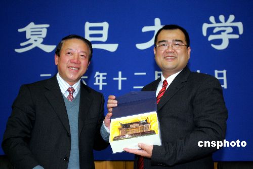十二月十七日,中国国民党副主席、青年团总团长林益世率中国国民党青年团一行,来到上海复旦大学进行参观访问。图为复旦大学秦绍德书记(左)与中国国民党副主席林益世(右)互赠纪念品。中新社发 汤彦俊 摄