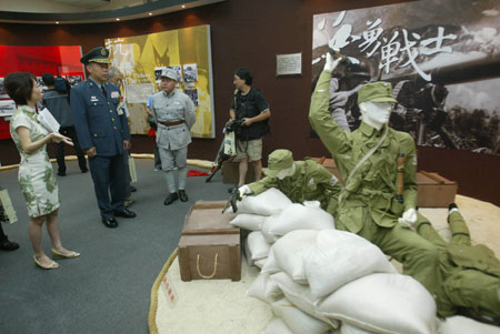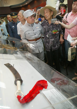 中新网7月6日电 据“中央社”报道,今年适逢七七卢沟桥抗战七十周年,台北“国军历史博物馆”六日起展出相关特展,并邀请曾参与该战役的老兵前往参观。展厅内系着红布条的大刀赫然在目。(苏圣斌)