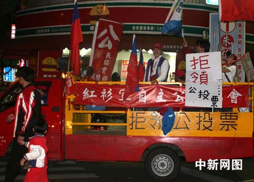 第七届台湾“立委”选举12日举行。图为11日晚,红衫军在扫街催票时诉求拒领“公投”票。中新社记者 陈立宇 摄