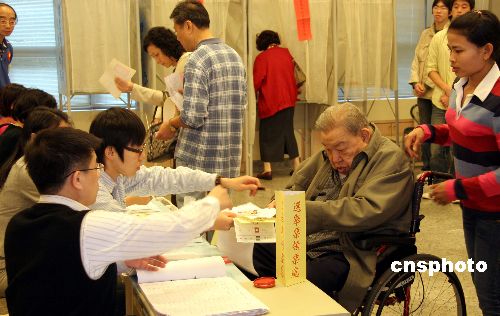 一月十二日是台湾第七届“立委”选举日,一位有障碍人士坐轮椅到所在选区的投票所领取选票,参加投票。