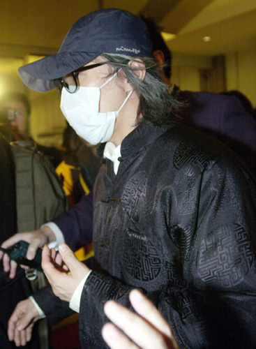 香港艺人周星驰一月二十九日搭机来台宣传新作,他以神秘装扮出现。( “中央社”图;刘得仓摄)