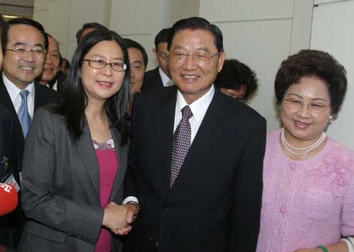 海基会董事长江丙坤(中)十一日启程前往北京与海协会展开中断九年的协商,台湾“陆委会”主委赖幸媛(前左)前来送机。( “中央社”图)