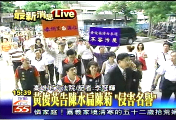 中新网6月20日电 高雄市长陈菊“当选无效”官司一审判决后,陈菊和陈水扁先后发表谈话引发黄俊英不满,黄俊英今日(20日)下午到高雄“地方法院”提出“民事告诉”,控诉陈水扁还有陈菊“侵害名誉”,并且要求登报道歉和金钱赔偿。