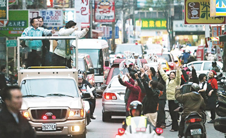 陈水扁自“三一九枪击事件”后,首度坐吉普车上街拜票。(图片来源:人民网)