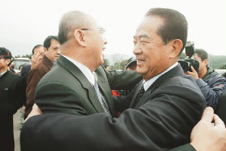 国民党主席吴伯雄(左)与亲民党主席宋楚瑜(右)一见面即热情拥抱,相互致意。