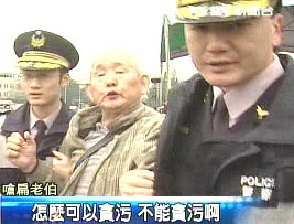 陈水扁在会上依旧鼓吹推动“入联公投”,但没想到台下却有民众呛扁,呛扁民众随即被警察带走;但又有民众高喊:“阿扁下台!”呛扁老伯念念有词:“怎么可以贪污,不能贪污啊!”老伯随后同样也被架走。(高大林)
