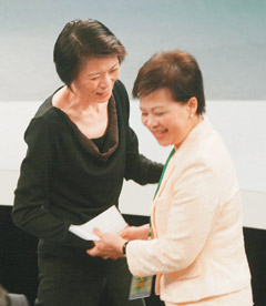 相对于周美青,长年跟着谢长廷南征北讨选举场的游芳枝,一身粉红色套装现身妇女座谈会,比起周美青职业妇女形象,她多了些雍容的贵妇气质,却又显得温柔婉约,提起各种政见应答如流,熟稔的程度丝毫不输谢长廷。