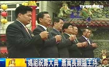 中新网4月9日电 妈祖绕境至嘉义新港奉天宫,举行祝寿大典,由萧万长主持,现场将近有10万信众,气氛庄严隆重。萧万长在家乡奉天宫感性致词并祈求两岸和平。