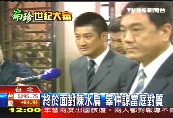 辜仲谅坐在证人席上、跷着二郎腿等待庭讯开始,看似轻松的外表下,其实内心有点忐忑紧张,当陈水扁踏入法庭时,两人都刻意避开眼神交集。
