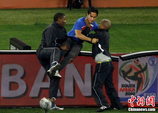 这已经不是南非世界杯上首起赛场闯入事件了。在6月21日墨西哥与乌拉圭的比赛中,一对墨西哥兄弟和一名美国球迷就成功的闯入了球场,不过他们只是随后被法庭处以500兰特(约合66美元)的罚款。