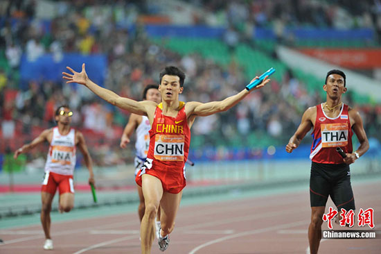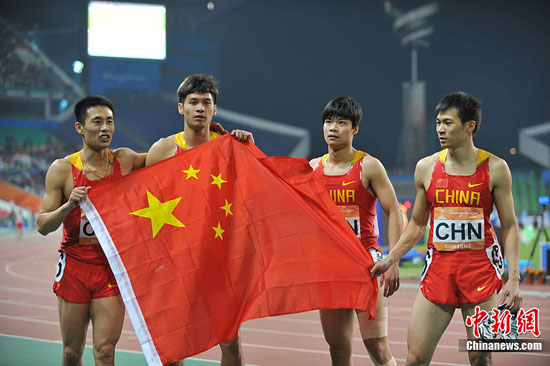 中新网11月26日电 在26日晚结束的广州亚运会田径男子4x100米接力决赛中,新科亚洲“百米王”劳义与陆斌、梁嘉鸿和苏炳添组成的中国队以38秒78的历史最好成绩夺得冠军,20年之后再次夺得亚运会接力冠军。