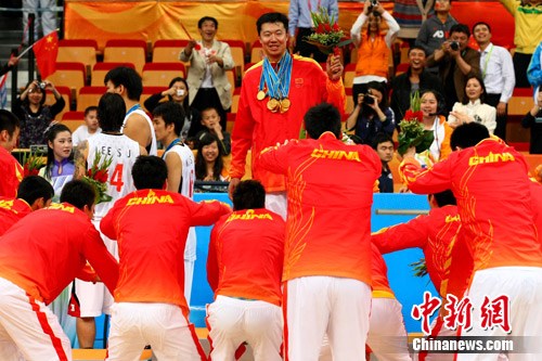 中新网广州11月26日电(记者 宗晨亮 卢岩)26日,依靠老将王治郅的神勇发挥,中国男篮最后关头顶住韩国队的反击,以77比71击败对手,夺得广州亚运会男篮金牌。