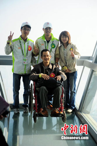 在广州塔一个拍照点旁,记者看到一位残疾人艰难地从轮椅上站起来,小心翼翼地走到拍照点要和志愿者们合影。这位姓游的市民表示,自己是土生土长的广州人,是这座城市发展的见证者。她说:“我是首次登顶广州塔,终于看到了成功举办亚运会开闭幕式的海心沙以及广州新中轴线的风貌,很美。我很高兴我生活在这样充满朝气的城市。”