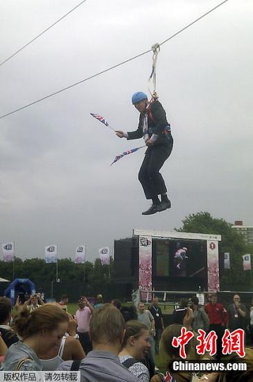 伦敦市市长鲍里斯 约翰逊为庆祝英国获得第一枚金牌而玩起“高空飞索”,不幸遭遇故障被悬挂半空,好几分钟上下不得。