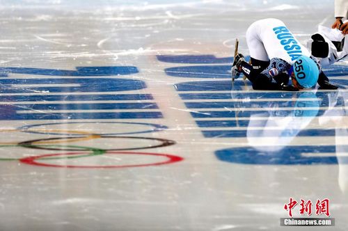 当地时间2月15日,2014年索契冬奥会短道速滑男子1000米决赛,俄罗斯包揽冠亚军,安贤洙以1分25秒325夺得金牌,格里格列夫以1分25秒399夺得银牌。图为安贤洙胜利后亲吻冰面。中新社发 富田 摄.jpg