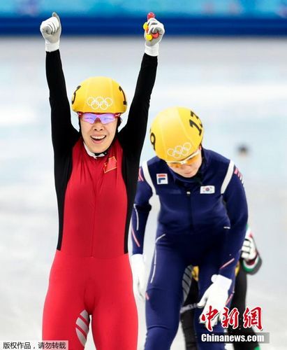 当地时间2月15日,2014年索契冬奥会短道速滑女子1500米决赛中,中国选手周洋夺得冠军,成功卫冕,这也是中国代表团本届冬奥会第三枚金牌。图为周洋庆祝夺冠。
