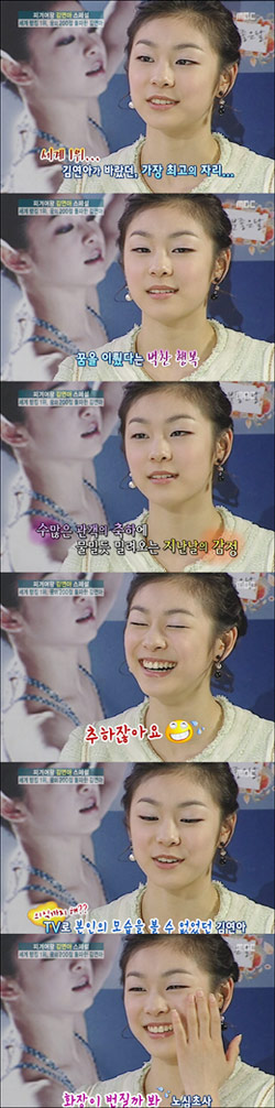 中新网4月30日电 据韩国《中央日报》报道,“花滑天后”金妍儿昨日做客MBC电视台,讲述了颁奖典礼的一些片段。她说:“听到国歌响起眼泪就止不住,我又担心哭的样子不好看,会把妆弄花,费了很大力气想忍住,但眼泪还是自然地流下来了。”