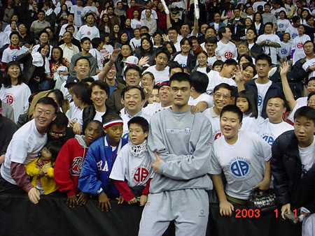 讲话之后,姚明首先来到113区,询问站在第一排的球迷俱乐部几位资深理事,我是站着还是坐着与你们照相?一直在张罗这项活动的姚明球迷俱乐部常务副会长乔凤祥教授和前会长谢忠齐声回答:“姚明,你就坐下与我们合影吧”!姚明在三位火箭队工作人员的陪伴下立即坐在第一排,再次与千百位华人球迷留下了一张新的大合影。几分钟后,姚明又到114区,与等候在那里的数百名华人球迷也合影留念。(劳荆)
