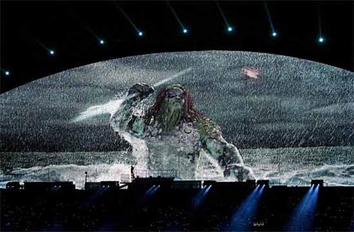 此次演出的舞台效果可谓集声光电以及焰火等高科技手段之大全,并运用了大量未曾使用过的先进科技。如运用高科技制作的“猎鹰”,一对翅膀长十二米,全部为钢材料,按照电脑控制在天空飞翔,效果逼真。