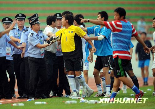 全运会比赛超越竞技层面。昨日,全运会男足甲组小组赛第三轮比赛结束,北京队3比1战胜天津队获得小组第一。输掉比赛的天津队不但在比赛中被罚下三名球员,赛后几乎所有队员都参与了追打主裁判的“工作”,替补队员12号赵世桐狂追了当值主裁判何志彪近100米并将其摁倒,使其脸部着地后狂打数拳,由此掀开了一场激战。