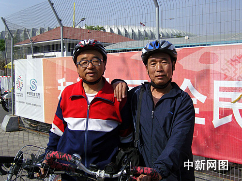 中新网济南10月25日电(记者 翁阳)10月25日是飞人刘翔进行第十一届全运会110米栏决赛的日子。中午时分,本社记者在济南奥体中心巧遇两名专程从石家庄赶来观看刘翔比赛的六旬老翁。杜存生和李云江这两位老人神采奕奕,一身专业体育装备,他们以单车每日百余公里的速度,用时三天来到济南。