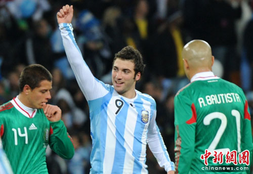 中新网6月28日电 今天凌晨2:30,南非世界杯1/8决赛再赛一场,阿根廷队在约翰内斯堡的足球城球场迎来了墨西哥队。凭借特维斯一个明显越位进球首开纪录,随后伊瓜因和特维斯各进一球,以3-1击败墨西哥,晋级八强。