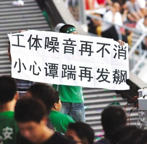 昨晚7点30分,2009赛季中超第14轮比赛全面打响,北京国安队主场迎战大连实德队。尽管昨天并不是周末,但北京工人体育场上座率依然很高,球迷们打出了各种个性十足的标语,如“工体噪音再不消 小心谭踹再发飙”,还有球迷身着“国安,跟丫死磕”的T恤衫到场为北京国安队加油助威。另外,大连蓝色激浪球迷也组织了声势浩大的助威团,专程从大连赶到北京为自己的球队加油助威。