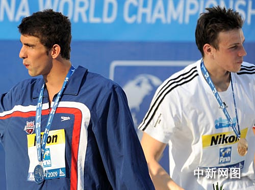中新社罗马七月二十八日电 (记者 宋方灿)北京奥运会的八金神话,已经成为“飞鱼”菲尔普斯的不可承受之重。在靠队友的神奇发挥而保住男子四乘一百米接力的金牌后,在个人的第一个罗马世锦赛项目上,他终于败下阵来,被德国选手比德尔曼轻松击败,结束了近四年的不败记录。
