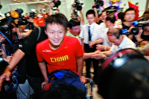 夺得7金的跳水队回国时并没有领导接机,北京籍游泳选手张琳在刚刚结束的罗马世锦赛上实现了中国男子选手金牌零的突破。北京市体育局局长孙康林率领一个欢迎队伍前往迎接,他们还打出了写有“祝贺中国游泳男子选手实现历史性突破”字样的条幅。