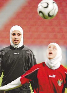 在女足赛场上,约旦女足特别显眼,她们头裹白色头巾、脚穿长筒袜。她们的球技不高,第一场比赛就被日本女足打了个13∶0。
