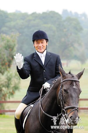 尽管成龙在众人心目中的形象更多是一位功夫明星,不过追星族近期看到他穿起马靴、戴起马帽化身马术骑士,代言今年夏天在中国香港举行的奥运马术赛。“2008年在奥运马术赛城市——香港见,”身着一身骑师装束的成龙说,他同时在镜头前抓着一匹漂亮黑马的缰绳。