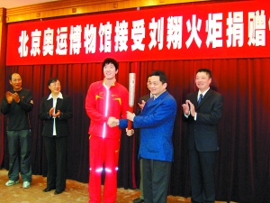 本报讯(记者丁肇文)今天上午9时45分,在上海体育职业学院刘翔的训练基地,“飞人”刘翔郑重地将北京奥运会第一棒火炬捐赠给北京奥运博物馆筹备处的代表。据悉,北京奥运博物馆今年年底前建成并开放后,将向公众公开展出这枚意义非凡的火炬。