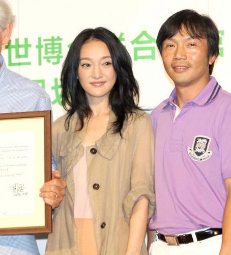 联合国开发计划署亲善大使、亚洲影后周迅与法国航拍专家Yann Arthus-Bertrand亮相上海世博园UN馆,出席了他们的环保电影《HOME》的首映活动。