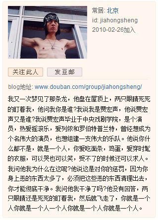 中新网7月6日电 昨天下午,内地男演员贾宏声在北京坠楼身亡,终年43岁。目前警方已介入调查,事件已排除刑事案件嫌疑,贾宏声的朋友也称其近期状态良好无征兆,但也有知情者称他在生前患有精神分裂疾病。这一点从他今年2月26日的最后一篇名为《你就是一个人》的博客日记似乎可见端倪。