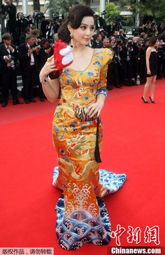资料图:2010年5月13日,第63届戛纳电影节如期开幕。众女星红毯上竞相争芳斗艳,女星范冰冰一身龙袍礼服亮相,惊艳全场