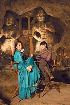 在蒙特利尔拍摄喜马拉雅大战的同时,导演也公布了片中部分人物的造型,其中在片中扮演封印“龙帝”的女巫紫娟的杨紫琼身着青色丝绸长袍,很是飘逸。而扮演守墓人后代的梁洛施淡紫色的上衣配上长靴也显得十分精神。两人所在的环境是一个供奉夜叉塑像的窑洞,烛火点点,气氛诡异。(记者 杨莲洁)