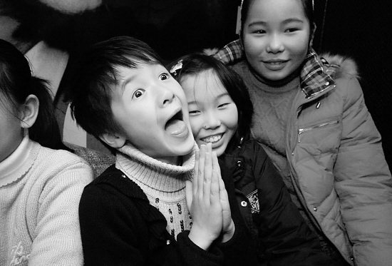 记者就坐在徐娇一家三口前面一排,大银幕上的徐娇在那里哭在那里笑,看电影的徐娇脸上是什么表情呢?记者回头发现,她看得十分认真,笑的时候一起笑,哭的时候却不哭。她说,已经看了很多遍了,都麻木了。要十岁的小朋友哭可不是件容易的事,有好几场哭戏,演的时候都哭不出来,妈妈只能拧她,疼得她眼泪一下就下来了。