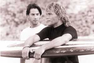 在1991年的《终极豪情》里,警探(左)和劫匪(右)通过冲浪结下了友情。