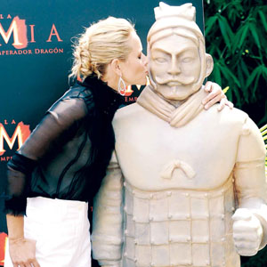 由李连杰、杨紫琼等众多华人影星参演的《木乃伊3:龙帝之墓》将于下周四(31日)在我国香港地区、新加坡和韩国上映,但内地观众则要到8月底才能有望一睹“龙帝”模样。不过这并不影响该片在全球刮起一股“中国风”。本周一,《木乃伊3》主演布兰登·弗莱泽、玛丽亚·贝罗与兵马俑出现在西班牙马德里时,再度燃起人们对兵马俑的好奇。