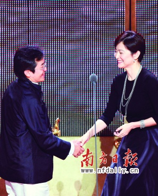 魏德圣获得年度台湾杰出电影工作者奖,颁奖人林青霞表示祝贺。