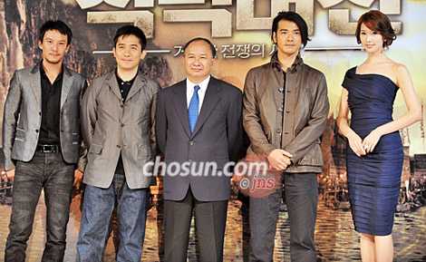 新片《赤壁》的主演梁朝伟、金城武、林志玲和导演吴宇森在首尔广壮洞华克山庄酒店举行了记者会。
