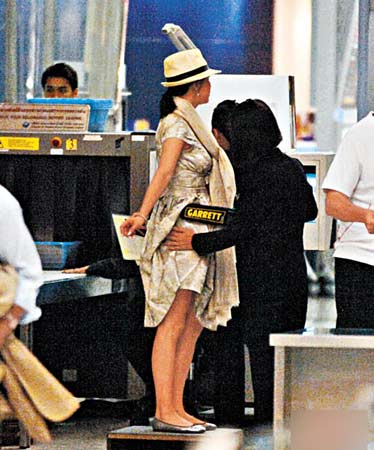 刘嘉玲和梁朝伟昨日凌晨由曼谷机场转飞不丹,临上机前二人如普通旅客一般,要经过金属探测机测试,未料嘉玲过关时竟发出BB声响,女关员即上前一手拿 金属探测仪器,一手摸嘉玲腰胸搜身,而嘉玲非常合作,自动脱掉帽子,挺直腰板任由女关员检查,最后安然过关开心上机。