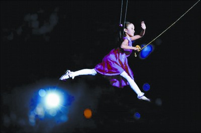 鸟巢上空,穿着粉红色连衣裙的女孩吊着钢丝在20余米高的空中放风筝,她叫朱巧妍。