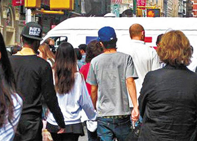 两人手拖手在纽约街头。