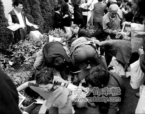 更有甚者,还有小偷来到混乱的现场企图混水摸鱼。现场记者说,本来打算去拍社会新闻的一家报社摄影记者,刚到现场就变成了社会新闻的主角。“他抓了一个人,说是偷相机的,二人扭打着从外面进来,后续没看到,反正警察也处理了……而这件事情教育所有的记者,把包拉到自己看得见的范围……”