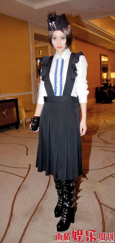 在所有范小姐的着装标识中,我们通常除了名牌看不到其他。但这一次,我们看到了,看到了可能是范冰姐企图对“风格”的一种创造。学院派裙子和摇滚靴子的组合,在范小姐的具体实践中,成为了大堂服务生的制服创新的最佳示范。