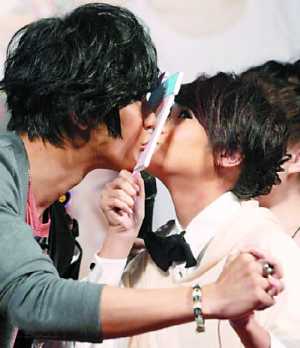 至于偶像剧《爱就宅一起》前日也在台北举行首映会,还是单身的杨丞琳和汪东城就在现场玩起了“安全之吻”。应主持人要求,亲吻长度将是收视率数字,两人为了有好采头,硬是吻了15秒,让台下观众拍掌叫好。